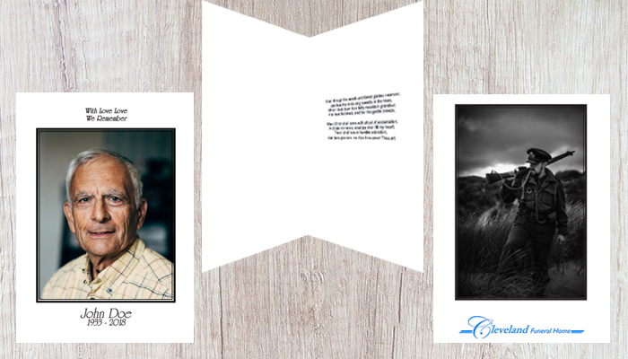 Cleveland's Remembrance Cards commemorate a loved one’s life. Printed on double sided card they can include a verse or prayer and photographs of the person who has died as well as some personal information. These cards are typically handed out at smaller funerals and memorial services.